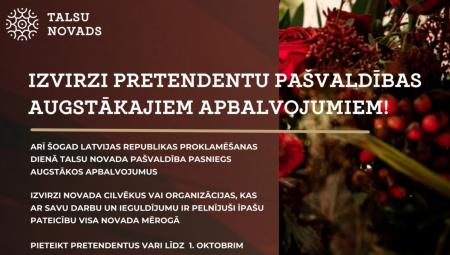 Ik gadu iedzīvotāji aicināti izvirzīt pretendentus Talsu novada pašvaldības augstākajiem apbalvojumiem, kas tiek pasniegti Latvijas Republikas Proklamēšanas dienā.
